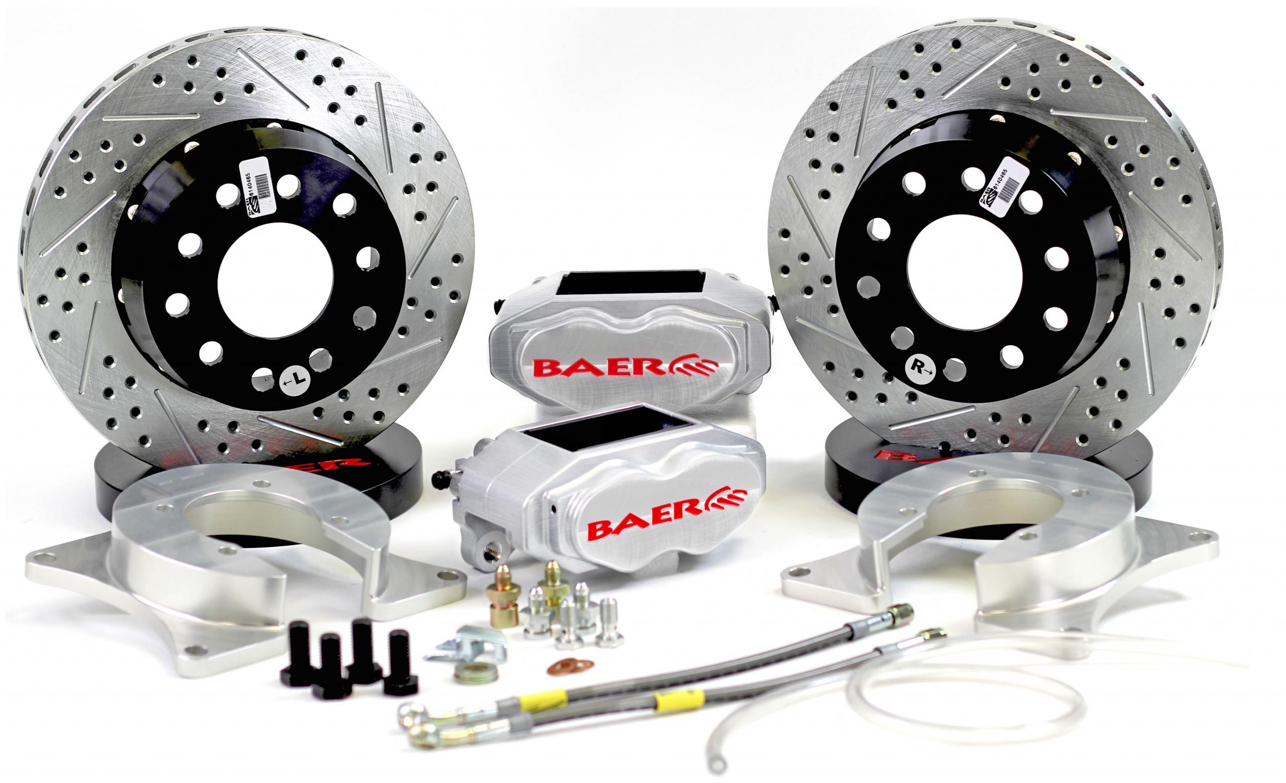 This rear system is designed as a Drag Race only part, and features 2 S4 4-piston calipers mounted to a 11 inch x 1 inch directional, 2-piece slot, drill, zinc plated rotor. There Is NO Park Brake In This System! This is designed specifically for heavy, fast drag cars that rely on their brake to launch or stage the car. The rear systems are specific to the housing end being used, if you are unsure of what ends you are working with please contact us direct. Note: Your axle flange will need to be turned down to 5.75 inches for this system to work. These systems are available in a variety of piston sizes. The larger piston area, 1.75 inches, will provide maximum clamping force, but can cause long pedal issues due to large volume requirements. A smaller 1.375 inch piston option was introduced, and has been a very popular option in classes such as NMRA True Steet where the cars will see limited street use. These rear systems are designed for racing only. If used on the street, due to brake bias change, be sure to spend some time to make sure adjusted correctly. Note: This system comes equipped with a high friction pad that is optimized for drag race applications. These pads often produce more dust and noise.