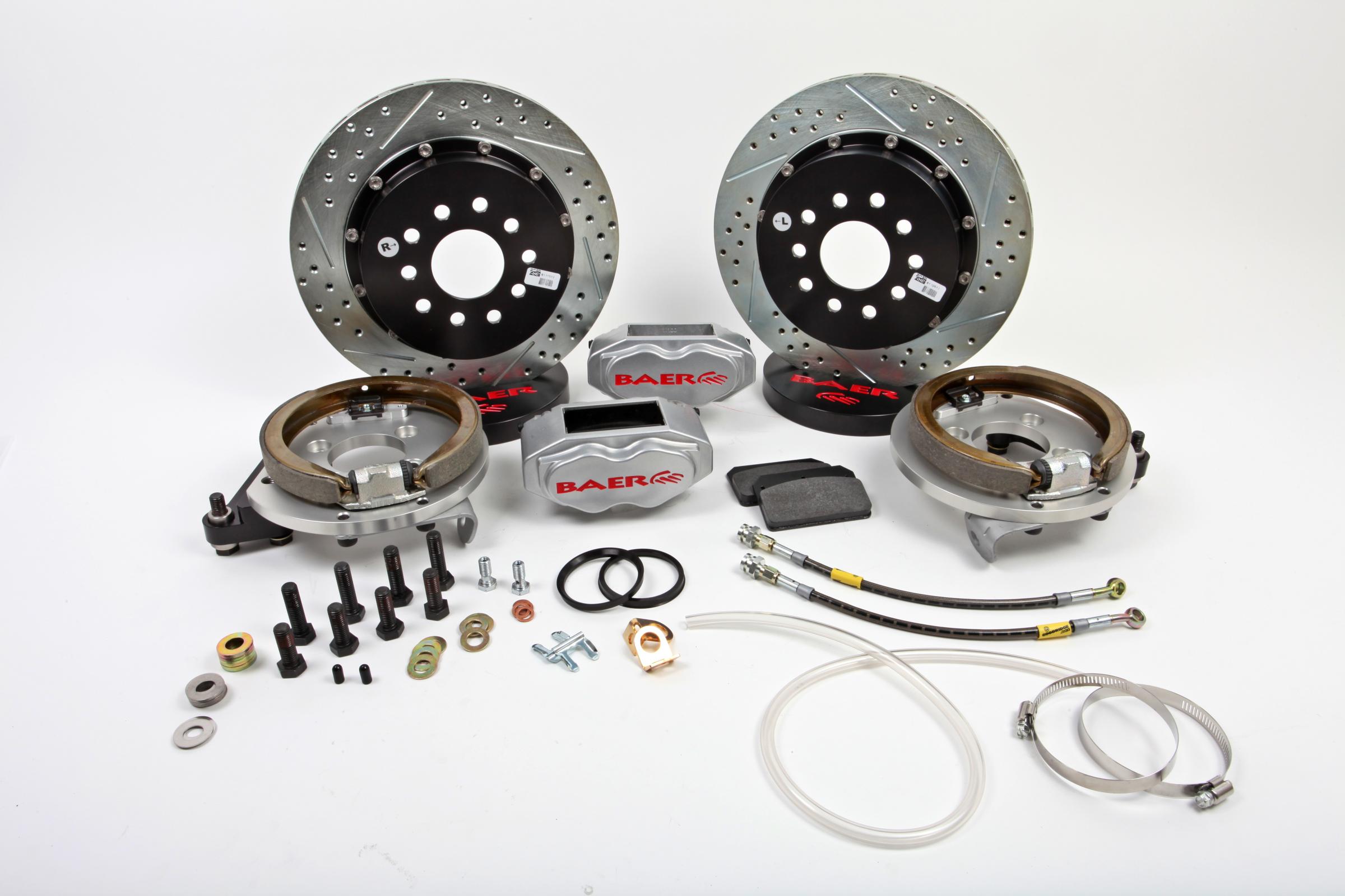 This rear system features the S4 4-piston caliper mounted to a 13 inch 2-piece slot, drill, zinc plated rotor. Baer systems include stainless steel brake hoses as well as calipers that have D.O.T. compliant dust and weather seals. Quality bearings used, along with NAS high grade stainless hardware for our pre-assembled 2-piece rotor. The SS4+ is designed just like Baers larger systems, but in a smaller package for 17 inch wheels. Park Brake Cables included.