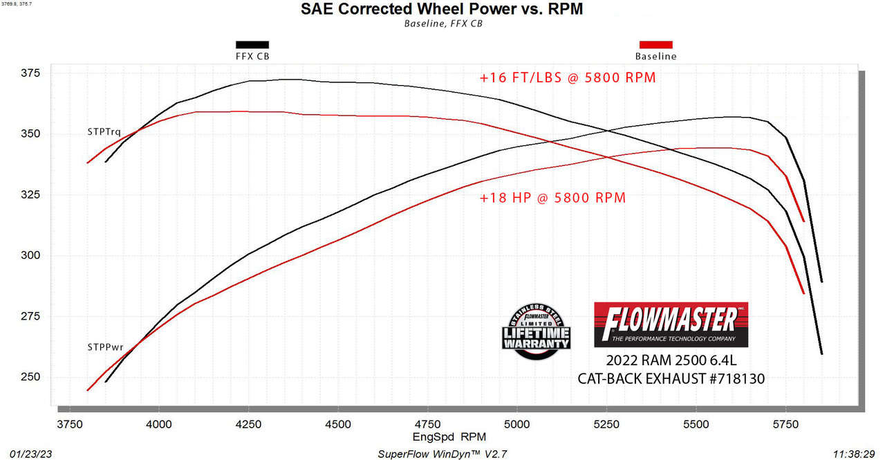 This Flowmaster® Flow FX® cat-back exhaust system for the 2014-2024 RAM 2500 trucks with the 6.4-liter HEMI engine is manufactured using durable 409 stainless steel throughout and features 3.50 to 3.00-inch mandrel bent pipes for better exhaust gas flow. Maximum increases on the dyno revealed 18 hp and 16 lb-ft of torque at the rear wheels over stock. This system exits with dual 4.00-inch black stainless steel tips for added style and a custom look. The system uses all the existing factory hanger locations and includes installation instructions and all necessary hardware for an easy installation that you can do at home. Backed by Flowmaster’s Lifetime Limited Warranty.