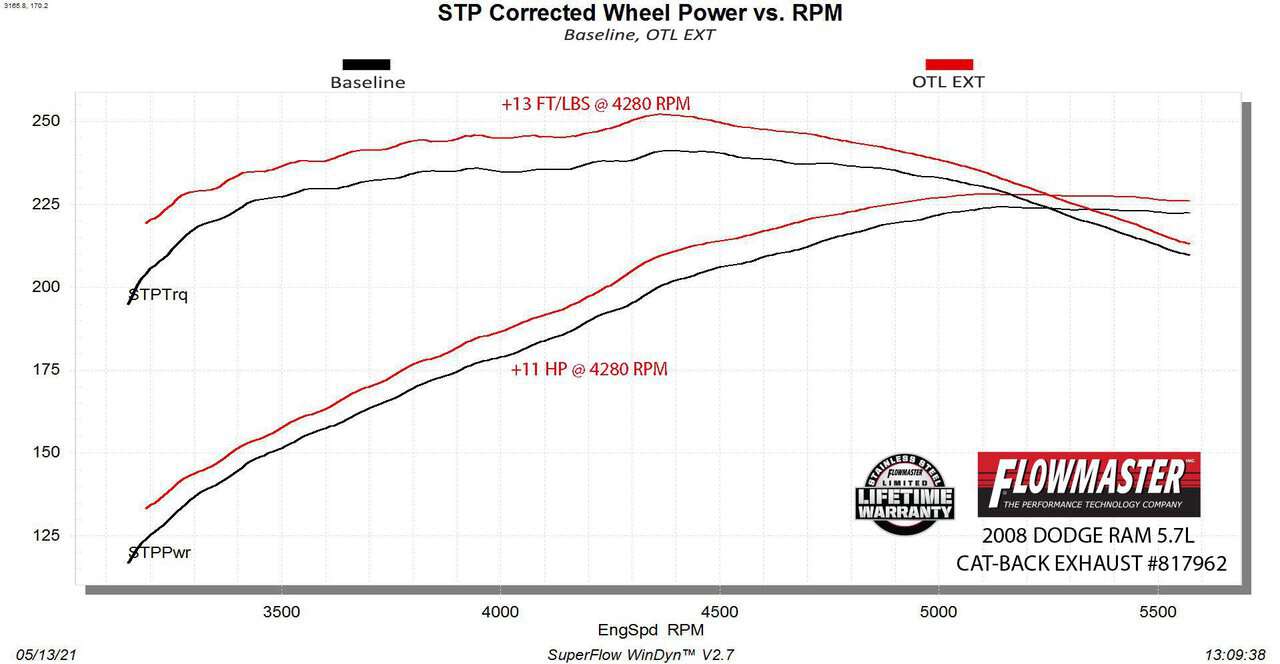 Flowmaster introduces our Outlaw Extreme stainless steel cat-back exhaust system for the 2006-2008 Dodge RAM 1500 trucks with the 5.7-liter engine. This system uses an Outlaw series muffler for a deep powerful sound and increased performance. 3.00-inch mandrel bent 409 stainless steel tubing allows for maximum exhaust flow and durability. The system has a turndown style, dump exit right after the muffler to eliminate the over-axle tailpipe. This elimination of the tailpipe helps improve ground clearance and departure angle when you are driving in more extreme off-road situations. This system produced max dyno gains of 11 hp and 13 lb-ft at the rear wheels. All of the necessary hardware is included, and factory-mounting locations are used for an easy installation. Backed by Flowmaster’s Lifetime Limited Warranty. Does not fit Mega-Cab models