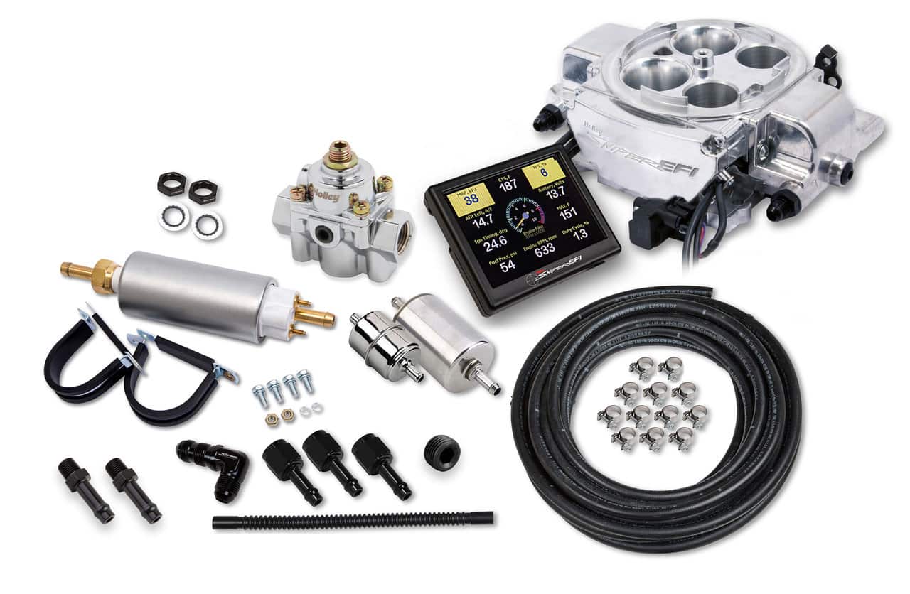 - Complete fuel system includes – external fuel pressure regulator preset to 58.5psi, 20ft of 3/8” Vapor Guard Fuel Hose, Fuel Pump, Filters, necessary hardware and bulkhead fitting to return fuel into the tank!