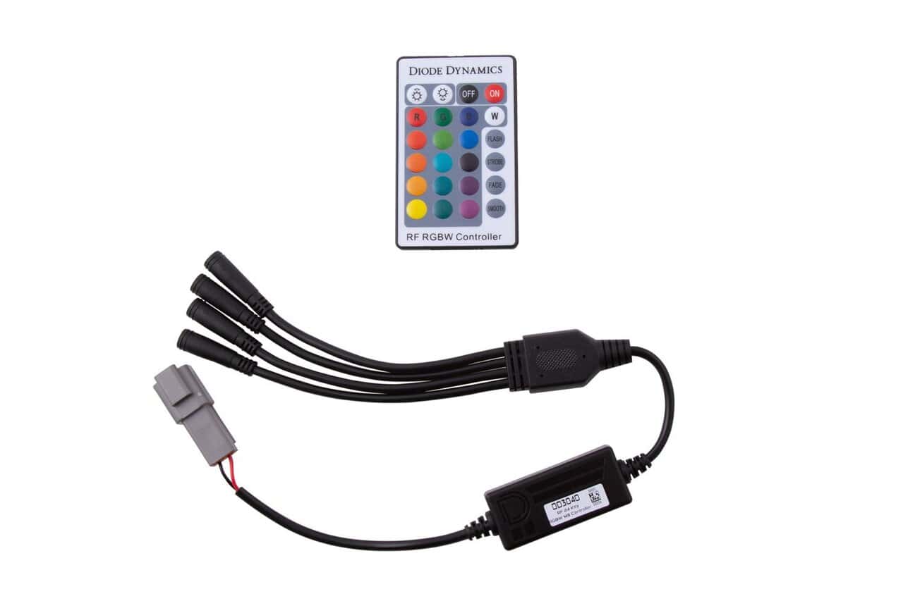 Easy Connection. With plug-and-play input and output connectors, simply plug into any standard 12V signal – we recommend parking lights or direct battery. Then, connect the outputs directly to your Diode Dynamics multicolor products, with no cutting, crimping, or splicing. This controller features a fully waterproof, compact enclosure, along with M8 output connectors for secure connections.